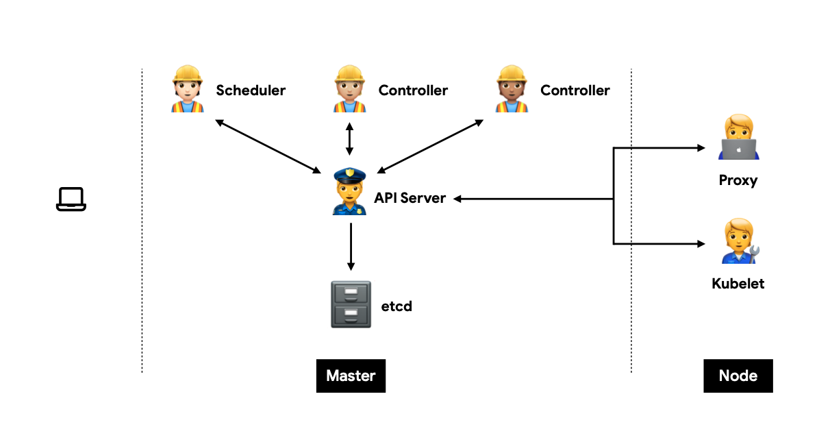 Maste에서 여러 Controller들을 통제하는 곳을 API Server라고 하고 상태를 저장하고 조회하는 것을 etcd라고 한다.