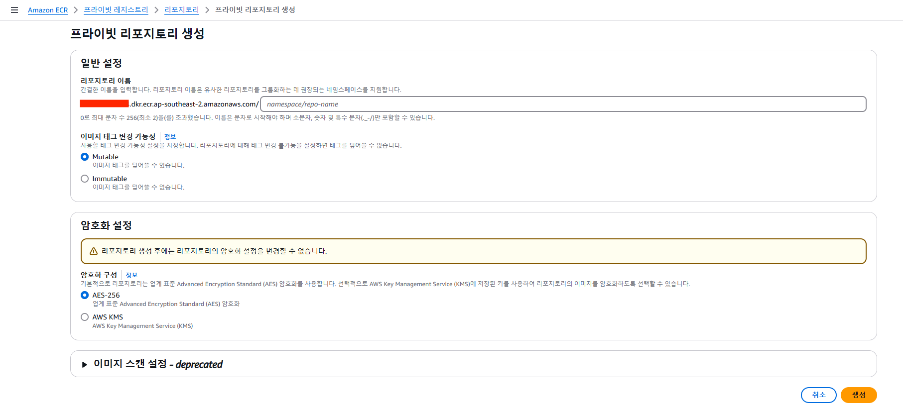 - 프라이빗 리포지토리 (Private) : AWS 프리 티어 일부로 매월 500MB 1년간 무료 (초과시 월 0.10 USD / GB)