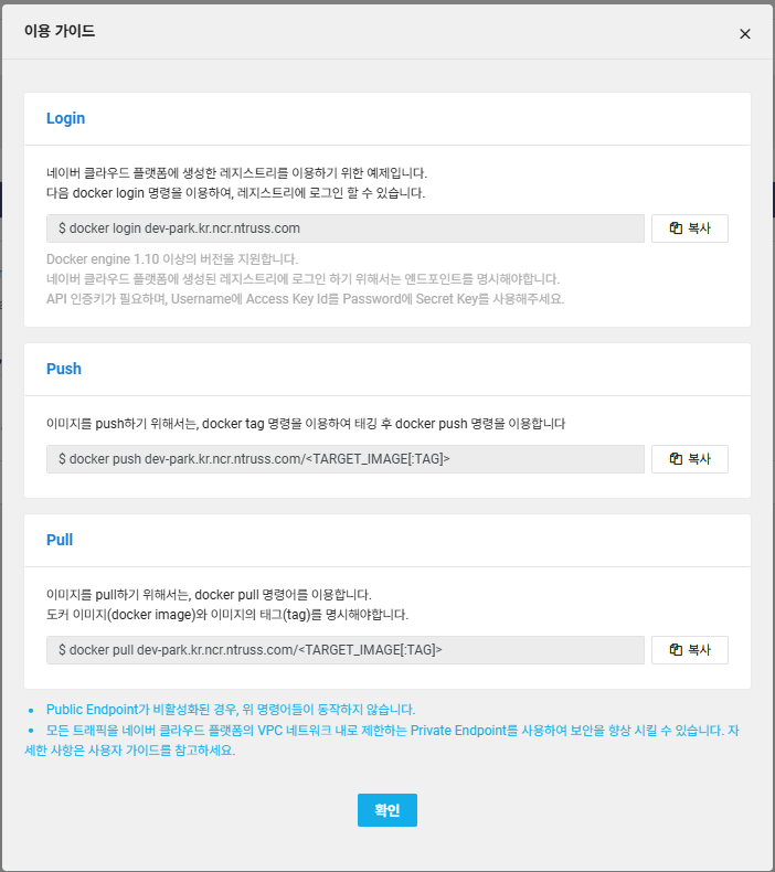 이용 가이드를 통해 아래와 같이 본인의 레지스트리에 맞는 커멘드로 사용할 수 있다.