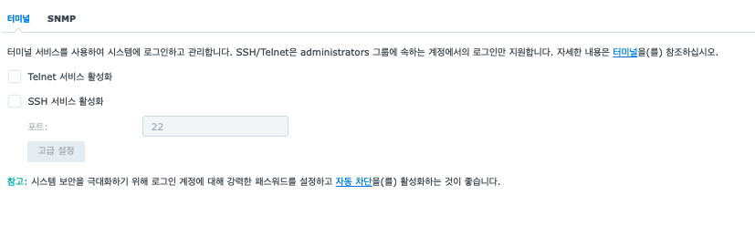 필자는 터미널을 이용한 Telnet, ssh 서비스를 사용하지 않는다. 해당 서비스를 이용하지 않는데 활성화 해두는 것은 해커가 공격할 수 있는 경로를 만들어 주는 것과 같다. 필자는 [그림 12]와 같이 해당 서비스를 비활성화 하였다.