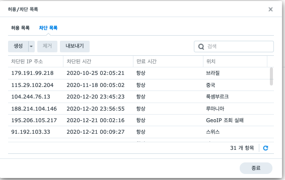 해당 설정을 통해 필자의 NAS는 [그림 7]과 같이 공격하기 위해 접근한 IP가 차단된 사실을 알 수 있다. 공격자로 확신한 이유는 개인적인 용도로 파일서비스만 운용하는 NAS에서 다양한 국적에서 접근을 시도할 이유가 없기 때문이다. 해당 IP가 차단된 사실은 앞서 설명한 푸시알람을 통해 즉시 관리자에게 제공된다.