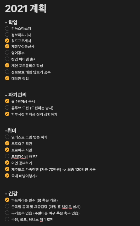 아래 사진은 20년도 막바지에 세웠던 나의 계획과 목표이다. 물론 첫 계획에서 추가된 내용도 있다. 결과적으로는 20년도 목표 대비 많은 것을 이뤘던 것 같다. 대학원이라는 새로운 출발도 했고 4.5 학점이라는 우수한 대학원 학점도 받았고, 개발자로서 첫 직장에서 스타트를 시작했다.