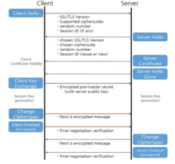 Mbed의 가장 큰 장점으로 꼽을 수 있는 TLS 보안 프로토콜을 제공한다. [그림 3]과 같이 TLS는 핸드쉐이크 절차를 통해 서버와 클라이언트가 암호화된 세션을 생성하기 전에 핸드쉐이크를 통해 상호인증을 하여 알고리즘을 이용하여 필요한 키를 교환하는 방식이다[4]. Mbed는 TLS 보안 프로토콜을 제공함과 동시에 관련 API를 제공하고 있다.