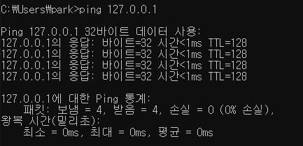 윈도우에서 localhost(127.0.0.1)에 ping을 보내면 아래 그림과 같은 결과가 나온다. 해당 결과가 의미하는 바는 127.0.0.1이 보낸 ping에 응답 하였고, 32byte의 Packet를 보냈을 때 1ms(밀리초, 1/1000초)만에 응답하였음을 의미한다. TTL(Time To Live)은 대상 컴퓨터에 보낸 패킷이 살아서 제 역할을 수행할 제한 시간을 의미한다. 대상 컴퓨터의 네트워크 상태와는 무관함.