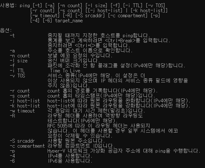 ping은 다른 호스트에 ip데이터그램 도달여부를 조사하기 위한 프로그램으로 TCP/IP 프로토콜 중 ICMP(Internet Control Message Protocol)를 통해 동작한다. ping 도메인명 혹은 IP를 입력하여 네트워크 상태를 확인하려는 대상을 향해 일정 크기의 패킷(Packet, 네트워크의 최소 전송단위)을 보낸 후(ICMP echo) 대상 컴퓨터가 응답하는 메세지(ICMP echo reply)를 통해 네트워크의 작동 여부와 상태를 점검 할 수 있다. 아래 그림은 ping 명령어의 윈도우, 리눅스의 옵션이다.