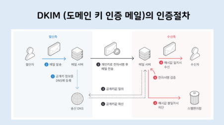 - 발신자는 사전에 자신의 DNS에 공개 키를 등록하고, 메일을 보낼 때 자신의 개인 키로 전자서명하여 전송.