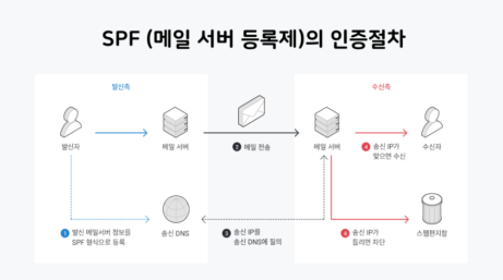 - SPF(메일서버 등록제)와 도메인 키 인증 메일(DKIM)을 활용하여 정당한 발신자인지 구분하는 기술.