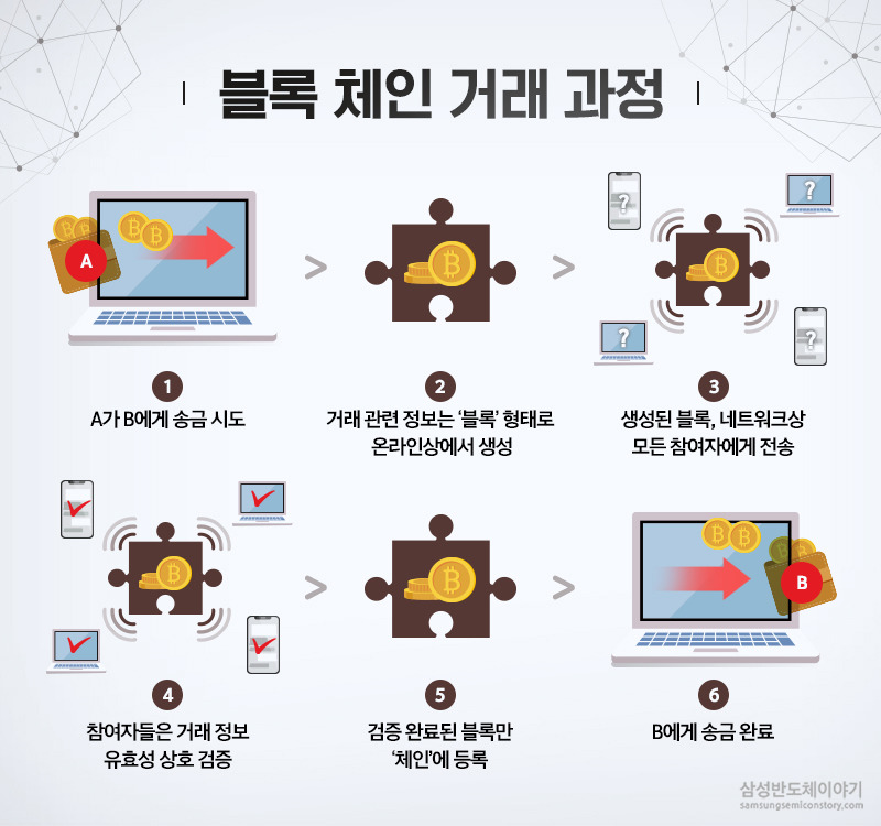 이러한 블록체인 특징으로 거래하는 과정은 아래 사진과 같이 특정 사용자가 송금을 요청한다면 거래 정보는 블록 형태로 생성되면 모든 참여자에게 전송된다. 수신받은 참여자들은 해당 정보의 유효성을 상호 검증하게 되고 문제가 없는 블록일 경우 체인에 등록하게 되며, 블록의 사본들은 모든 참여자의 컴퓨터에서 동일하게 분산 저장된다. 이처럼 블록체인 거래가 이루어질 때마다 거래 참여자들끼리 정보를 공유하고 대조하기 때문에 데이터를 위/변조하기 어렵다는 특징을 갖고 있다.