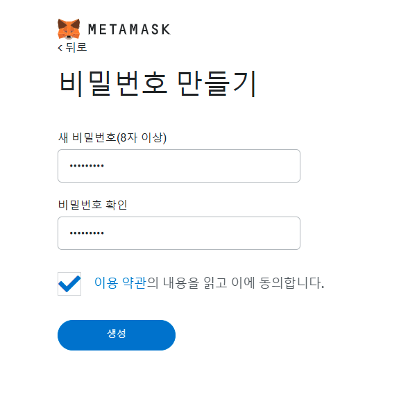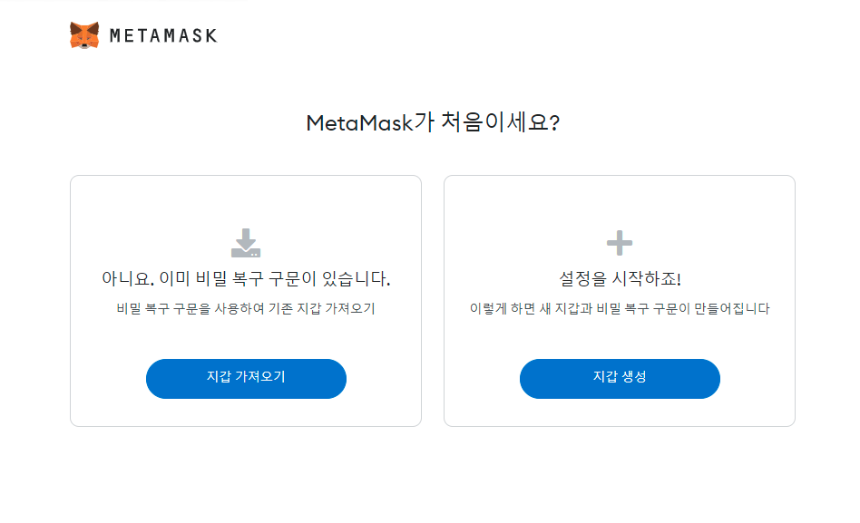 크롬에서 확장프로그램으로 설치하면 아래와 같이 지갑을 생성하는 창이 뜨게 된다.