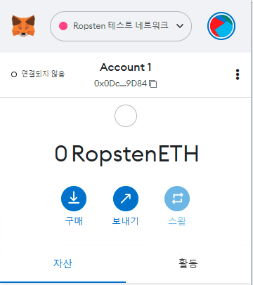 활성화 하고 나면 아래와 같이 Ropsten 테스트 네트워크로 활성화 된 모습을 볼 수 있다.
