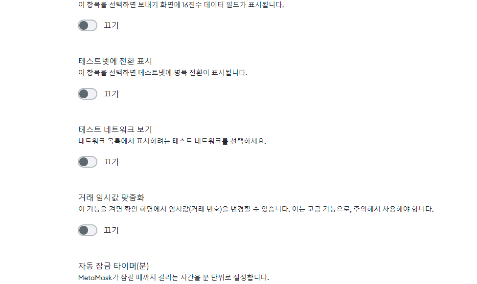 아래 테스트 네트워크 보기를 켬으로 변경한다.
