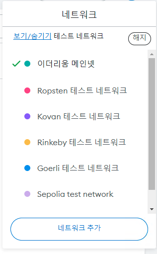 테스트 넷을 활성화 하기 위해 보기/숨기기를 클릭한다.