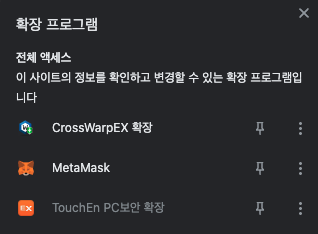 설치이후 크롬 확장프로그램에 정상적으로 MetaMask가 뜬다면 정상적으로 설치된 것이다.