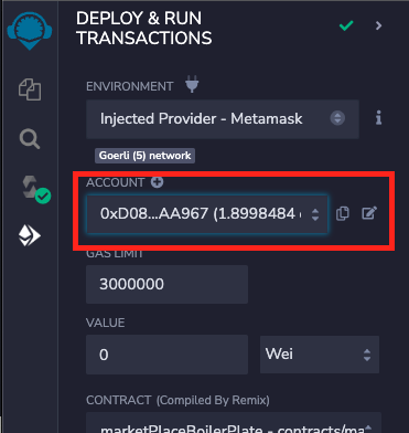 DEPLOY & RUN TRANSACTIONS 탭으로 이동하여 ENVIRONMENT를 Metmask로 지정한다. 이후 메타마스크 창이 뜨는데 로그인 후 현재 테스트넷으로 지정되어 있는지 확인합니다.