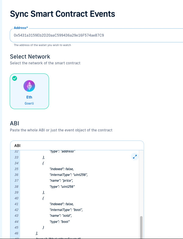 아까 컴파일 후 메모해둔 ABI에서 MarketItemCreated 파트만 복사하여 ABI에 기입한다.