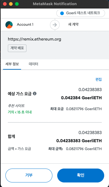 Deploy를 클릭하면 Metamask 창에서 아래 만큼의 가스 비용을 지불할 것을 요청한다. (가스비용은 컨트랙트를 배포할 때 지불하는 일종의 수수료 개념이다.)