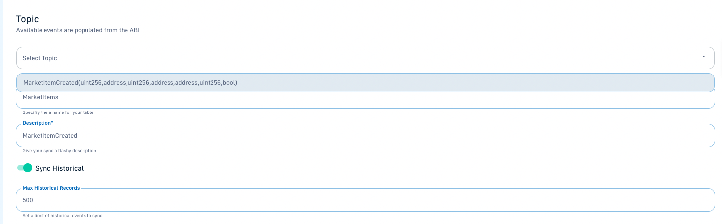 앞서 ABI에 MarketItemCreated 파트를 기입했다면 자동으로 MarketItemCreated Topic이 생긴다. 해당 Topic을 선택하고, Table은 반드시 MarketItems로 입력한다. Description은 임의로 기입한다.