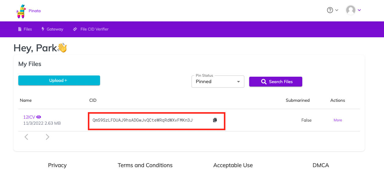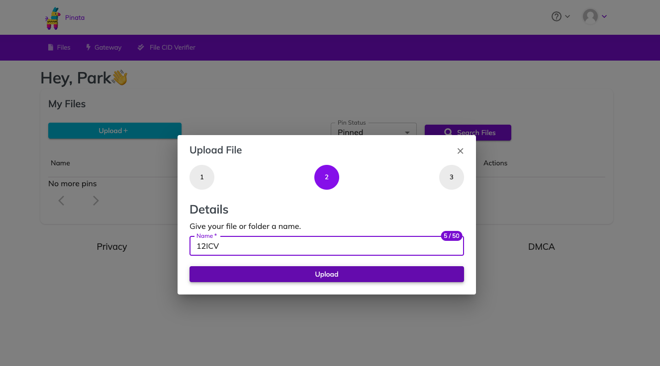 IPFS 서비스 Pinata에 이미지 파일(jpeg, png 등)을 등록.