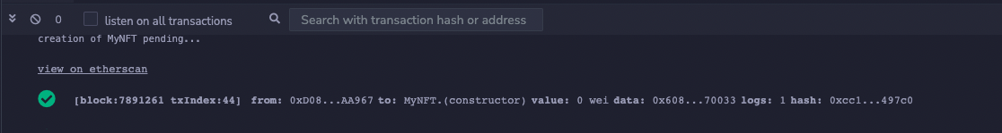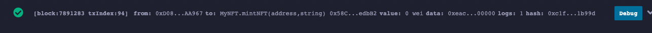 Smart Contract가 체결되면 mintNFT 항목에서 recipient 항목에 자신의 지갑주소, tokenURI에 Pinata에 JSON 형태로 업로드한 ipfs://Metadata CID 를 입력한다. 이후 transact 버튼을 클릭하여 NFT 민팅을 수행하고 자신의 지갑으로 전송한다. 아래 콘솔창에서 전송결과를 확인한다.