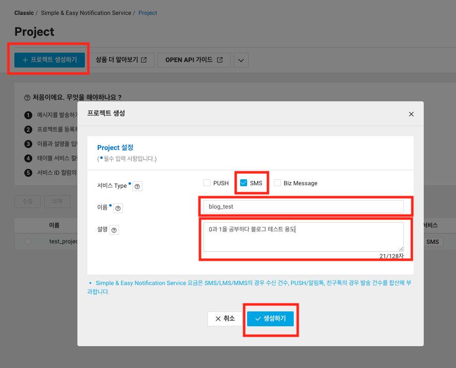 Simple & Easy Notification Service에서 아래 사진과 같은 방법으로 프로젝트를 생성한다.