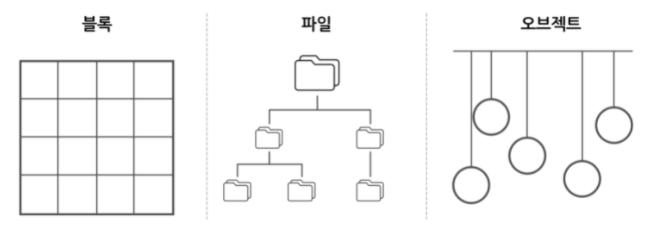 데이터 저장소에는 오브젝트 스토리지(Object Storage), 파일 스토리지(File Storage), 블록 스토리지(Block Storage)가 있다.