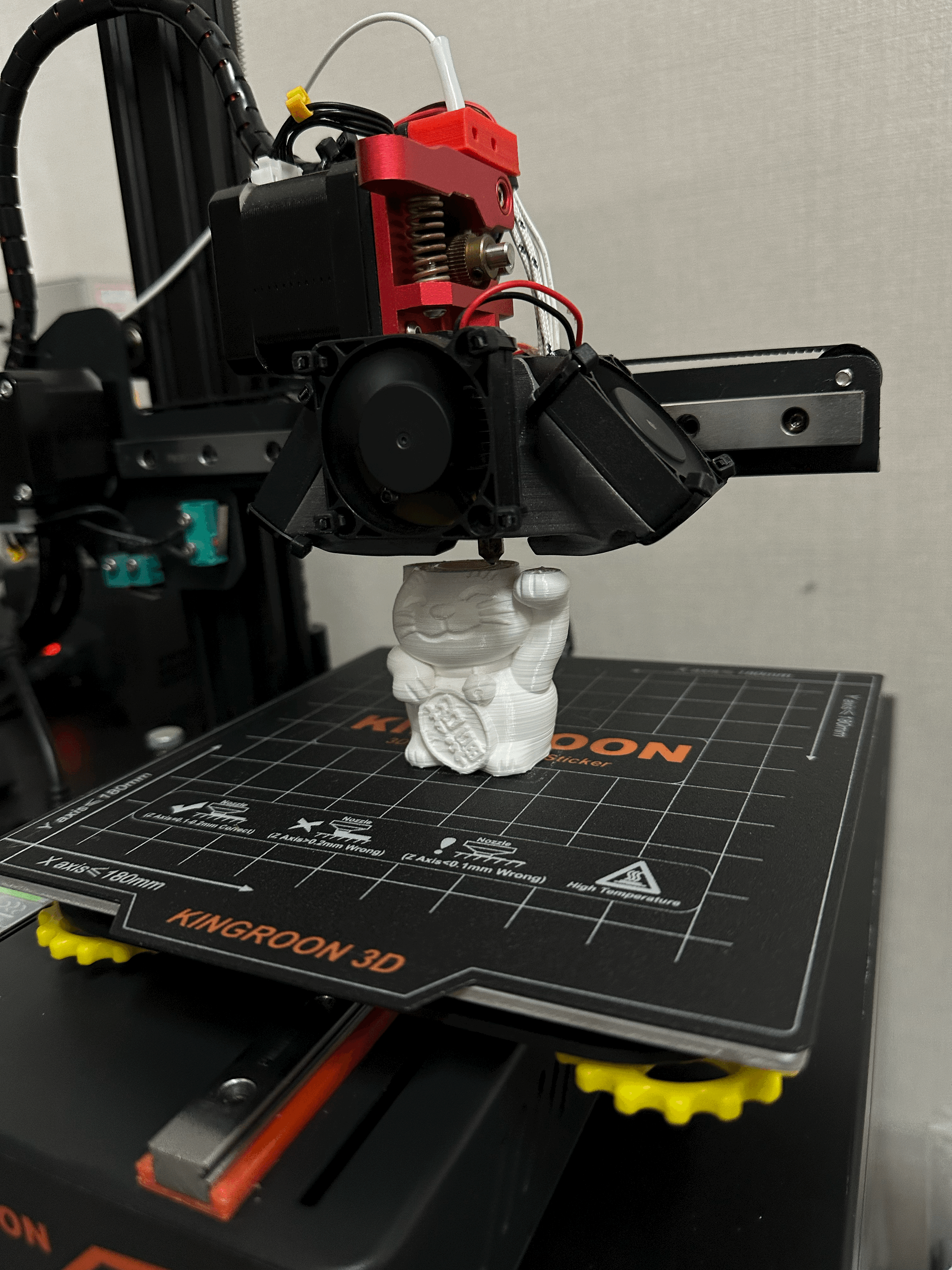 판매자분께서 SD카드에 넣어둔 테스트 인쇄파일을 무작정 인쇄해보았다. 무슨 파일인지 모르고 인쇄했으나 시간이 지날수록 일본 고양이 마네키네코임을 인지하였다. 아래는 인쇄과정에서 촬영한 영상이다. 영상을 보면 알겠지만 소음이 엄청난다. 3D 프린터 특성상 오랜기간 인쇄하기 때문에 개인 휴식공간에 설치하면 매우 불편하겠다는 생각이 들었다.