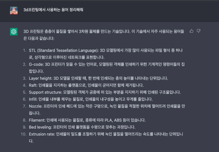 우선 용어 수집을 위해 요즘 가장 핫한 ChatGPT를 통해 3D 프린팅 관련 용어를 물어봤다. 역시 깔끔하게 3D 프린터 관련 용어를 정리해줬다. 본 글에서는 ChatGPT를 기반으로 정보를 얻고 추가적인 정보를 보충하는 형태로 게시글을 작성한다.