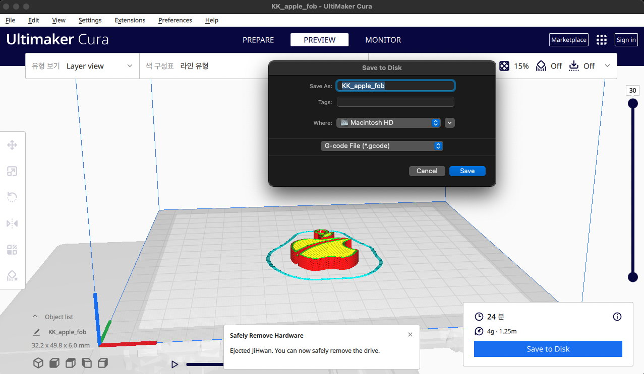 (4) Save to Disk를 클릭하여 프린터에 업로드할 gcode를 생성한다.