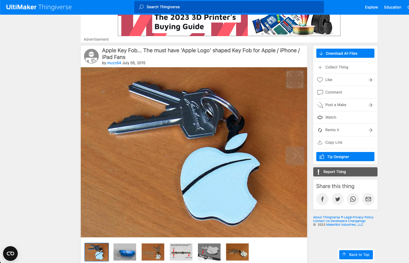 (1) 테스트 프린팅을 위해 thingiverse(https://www.thingiverse.com/) 에서 원하는 모델링 파일을 내려받는다. 필자는 Apple Logo를 검색하여 키링 STL 파일을 내려받았다.