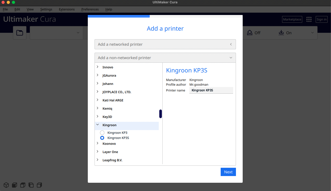 (2) 이전 구버전 큐라에서는 따로 프로파일을 넣어줘야 했는데 신버전(5.2.2)에서는 Kingroon Printer가 기본으로 포함되어 있다. Add a printer에서 Kingroon KP3S 모델을 선택한다.