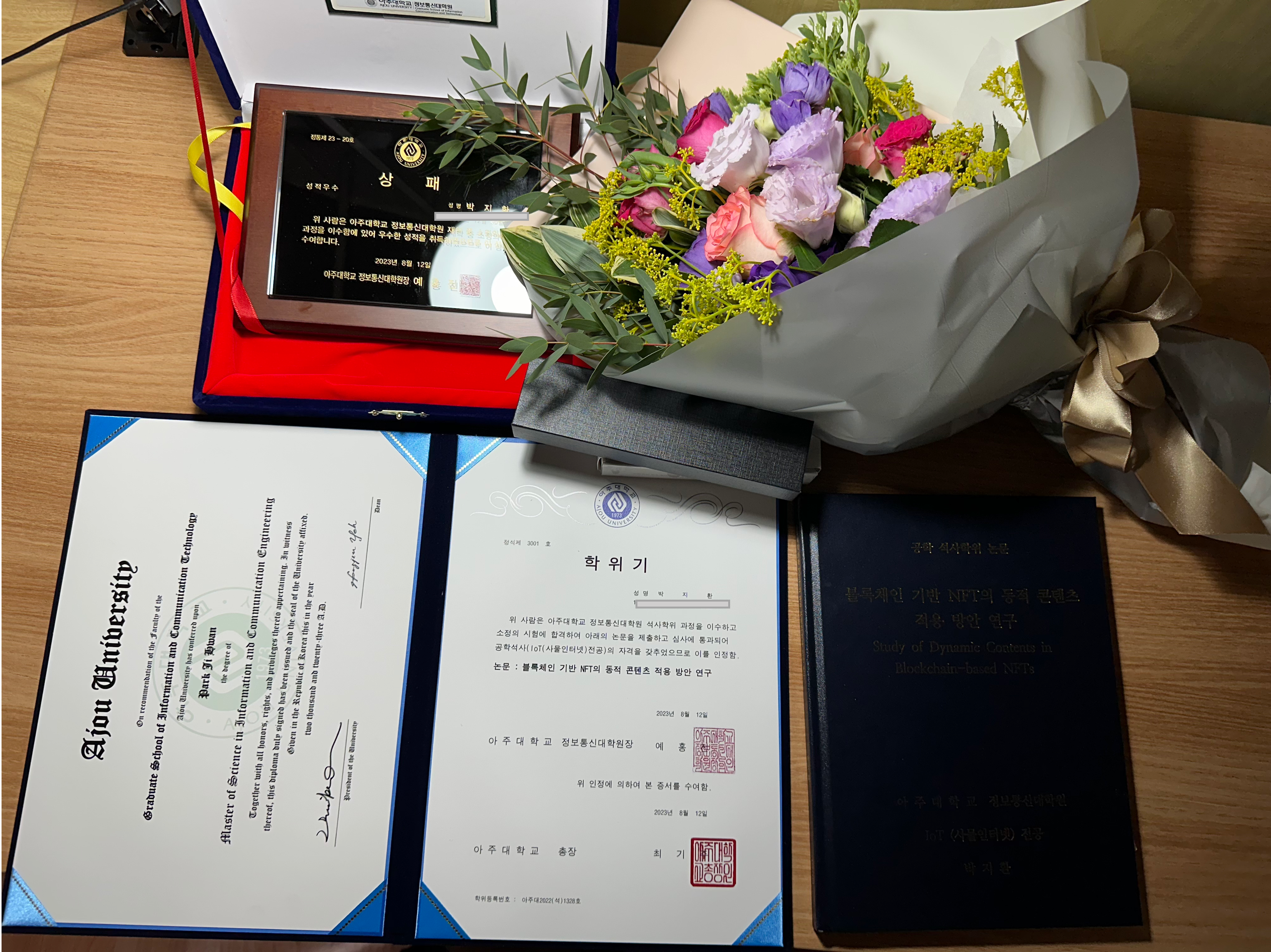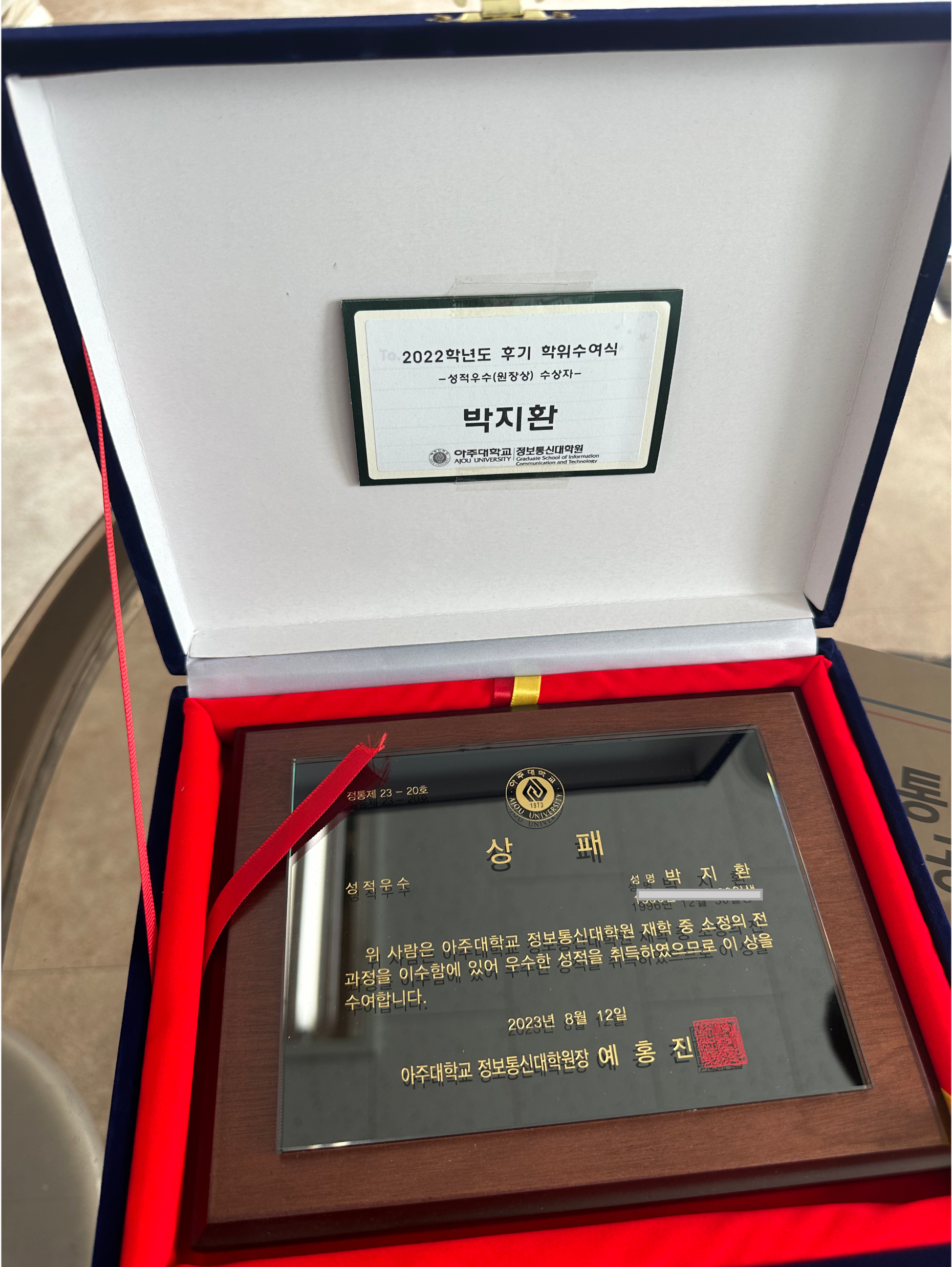 석사과정에서 성적이 크게 중요한 것은 아니지만 성적우수 부분에서 상패를 수여받았다. 과에서는 수석으로 상패를 수여받았다. 그래도 2년동안 열심히 학업에 임했구나 하는 생각에 뿌듯한 마음이 들었다.
