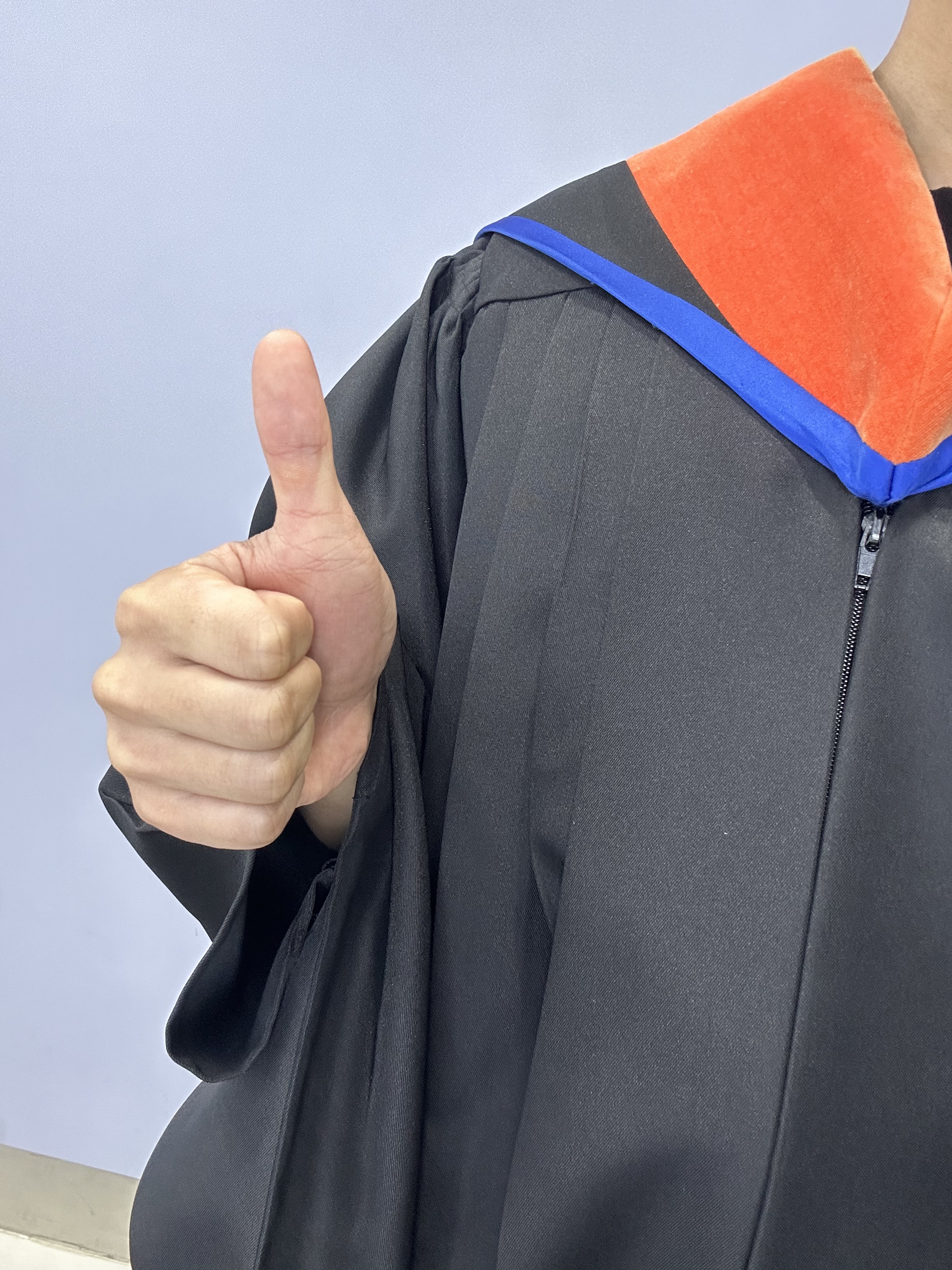 졸업식 시작전 학위복을 대여했다. 석사부터 학위복은 학사과정과 다르게 오렌지색 머플러를 착용한다. 오렌지색은 공학분야 학위를 의미하는 컬러이다. 우리 학교의 학위복은 석사를 의미하는 두줄의 쉐브론 장식은 없었다.