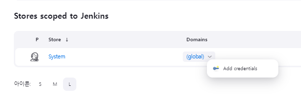 Dashboard - Jenkins 관리 - Credentials에서 “Add credentials”을 클릭하여 새로운 인증 정보를 추가한다.
