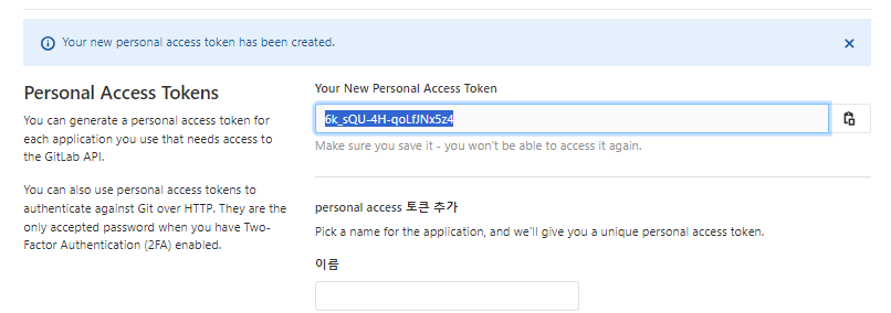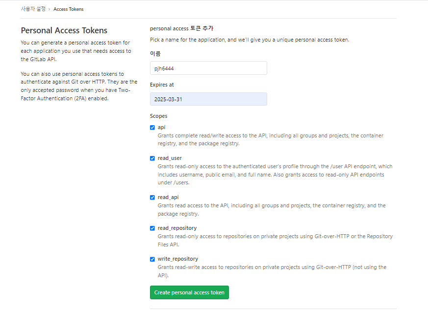 GitLab에서 사용자 설정 - 액세스 토큰으로 이동한다.