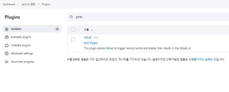 Dashboard - Jenkins 관리 - Plugins에서 “Git“과 “GitLab”을 검색하여 설치한다.