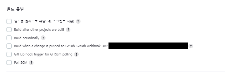 - Build when a change is pushed to GitLab. GitLab webhook URL: 변경 사항이 GitLab 에 푸시되면 빌드(push와 같은 이벤트 기반으로 동작. GitLab → Jenkins 통지)