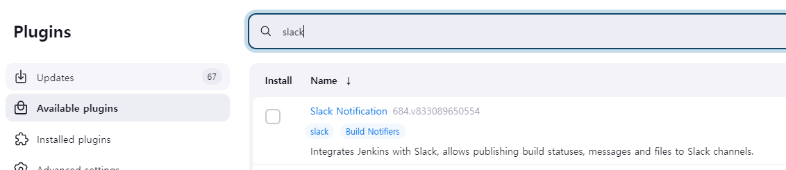 젠킨스 관리자 페이지의 Plugins - Available plugins 에서 slack 검색 후 Slack Notification 을 설치한다.